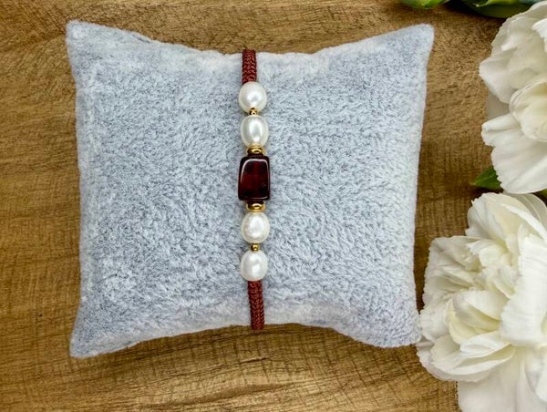 🤍 Bransoletka ręcznie pleciona z perłami i bursztynem.