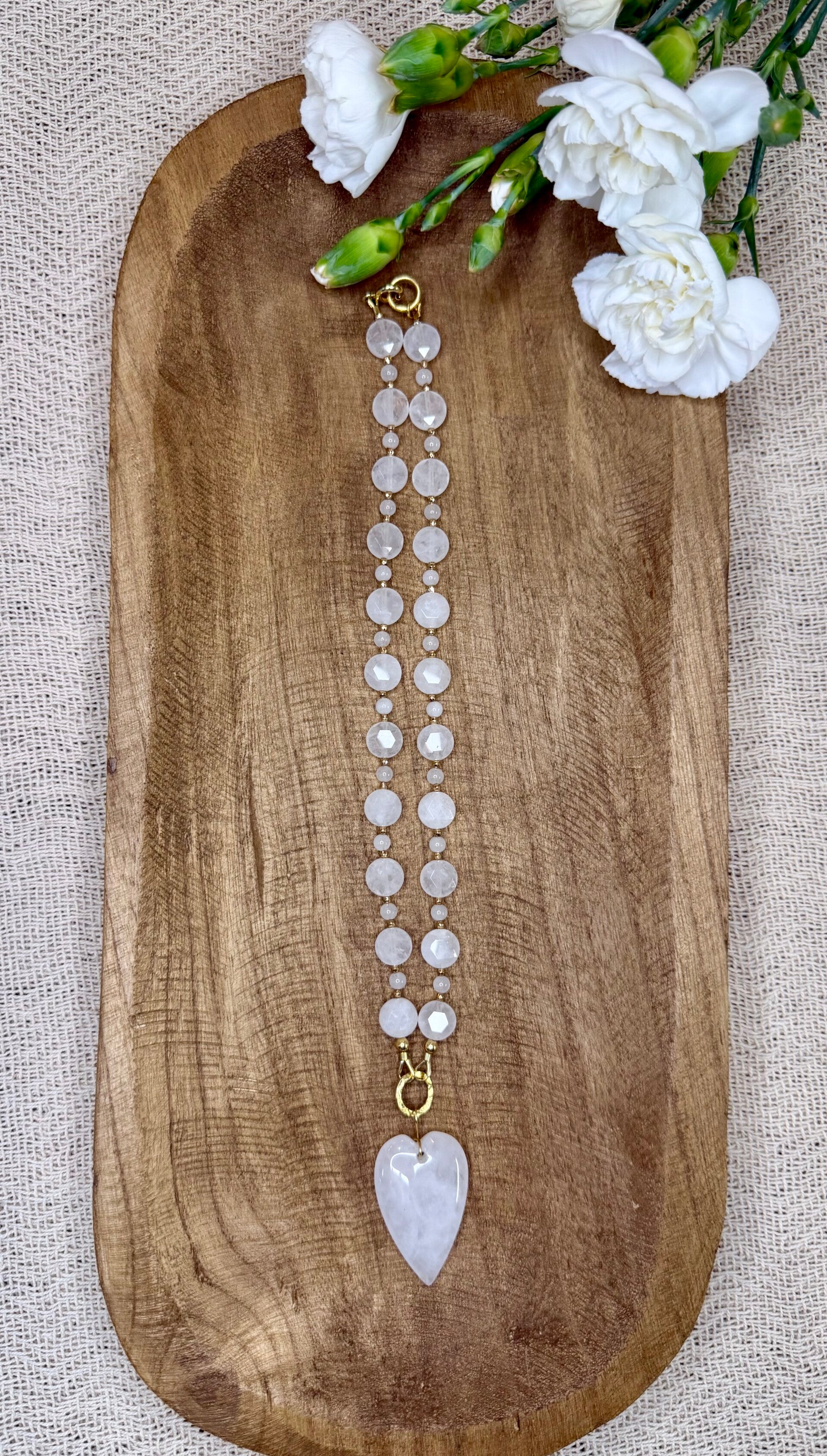 馃拵 Kamienna zawieszka serce wykonana zosta艂a z Kryszta艂u Górskiego, Pozosta艂e kamienie to Kwarc bia艂y i z艂oty hematyt.